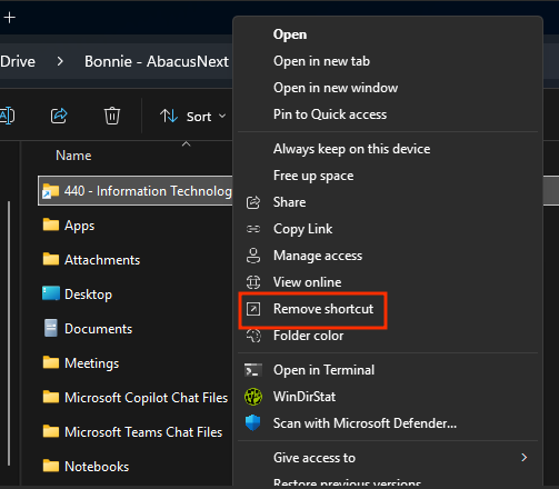 2. On the next menu, select "Remove shortcut". The shortcut will not be removed immediately. Please allow some time for SharePoint to sync and complete the removal process.